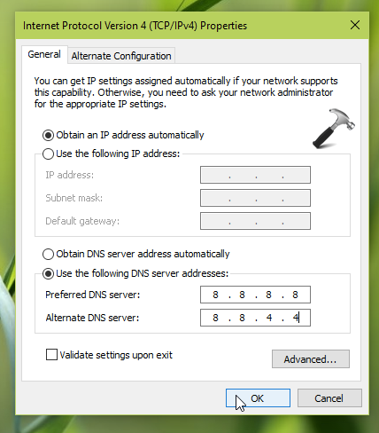 この例では、Google DNS値を使用しています。 Exitオプションの検証設定を確認し、[OK]をクリックします。