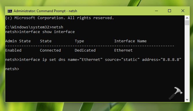 interface ip set dns name="Ethernet" source="static" address="8.8.8.8"