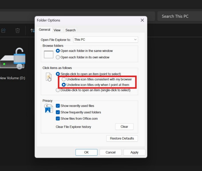 4。の下一般的なタブのフォルダオプションウィンドウ、あなたが見つけるでしょうシングルクリックしてアイテムを開く([ポイント]設定を開きますその真下次のセクションとしてアイテムをクリックします。