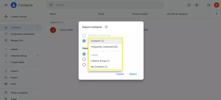 2。選択します輸出左側のメニューから選択します連絡先次のプロンプトのラジオボタン。