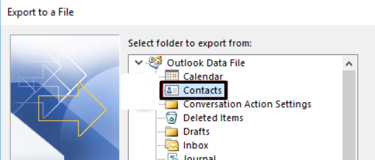5。拡張しますOutlookデータファイルセクション、を選択します連絡先オプション、次にクリックします次に>ボタン。