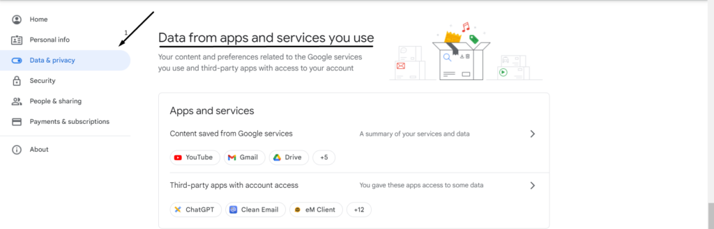 2。Googleアカウントにサインインしたら、データとプライバシー左側のサイドバーからオプションと移動します使用するアプリとサービスからのデータ。