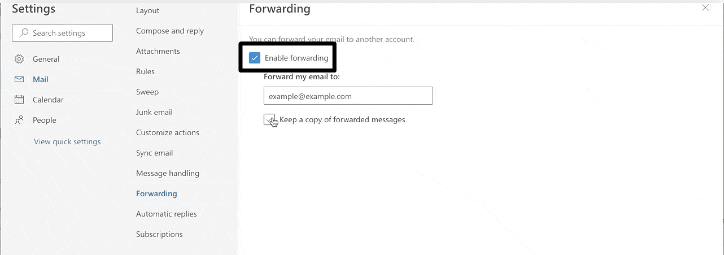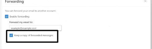 4。チェックします転送を有効にしますチェックボックスをチェックして、新しいメールアドレスを入力します私のメールを転送します:テキストフィールド。