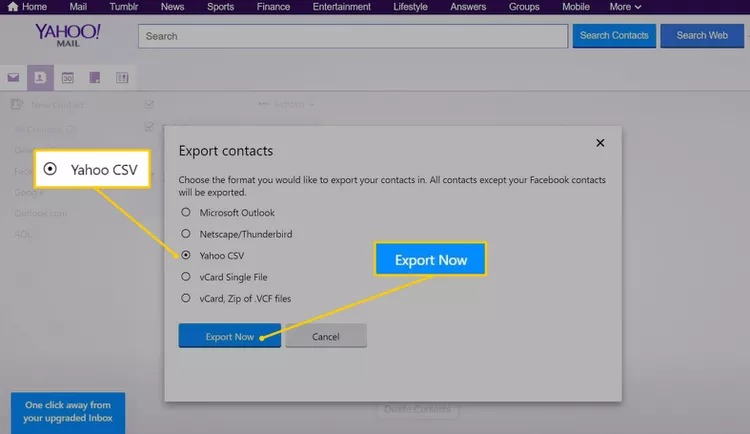 4。を選択しますYahoo CSVラジオボタンは.CSVファイルで連絡先をエクスポートし、クリックしてからクリックします今すぐエクスポートしてください。