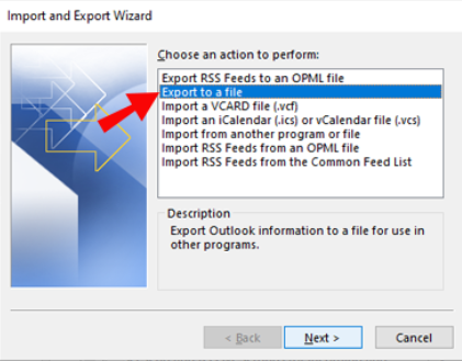 3。をクリックしますファイルにエクスポートしますのオプションウィザードをインポートおよびエクスポートしますプロンプトとクリックします次に>。