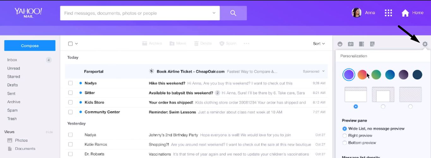 1。あなたを開きますYahoo!郵便アカウントとに進みます設定をクリックしてセクションギヤアイコン。