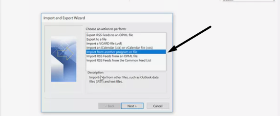 3。を選択します別のプログラムまたはファイルからインポートしますのオプションウィザードをインポートおよびエクスポートしますプロンプト。