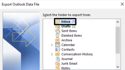 5。を選択します受信トレイのフォルダーOutlookデータファイルをエクスポートしますウィンドウをクリックします次に>ボタン。