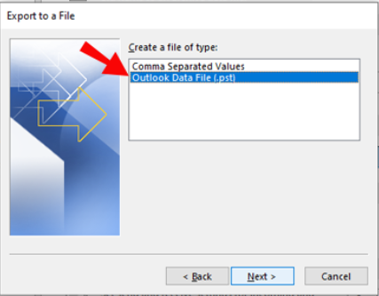 4。を選択しますOutlookデータファイル(.pst)次のウィンドウのオプションをクリックします次に>ボタン。