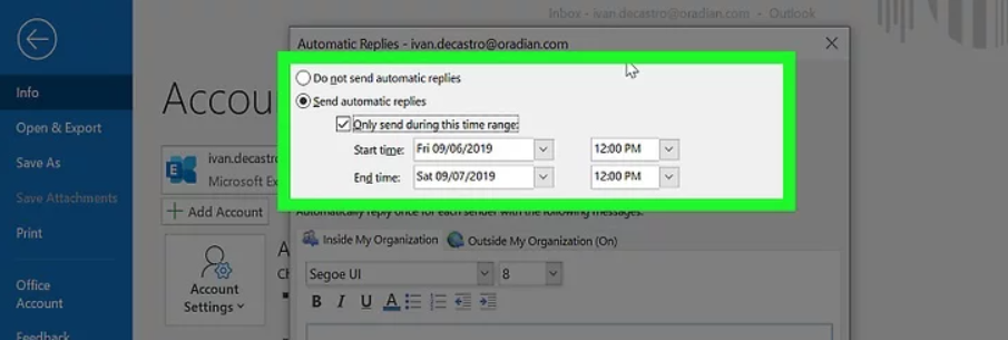 3。を選択します自動応答を送信しますラジオボタンとアンティックこの時間範囲でのみ送信してください箱。