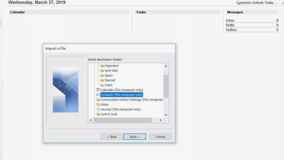 7。すべての連絡先をインポートするOutlookフォルダーを選択しますファイルをインポートしますプロンプト。