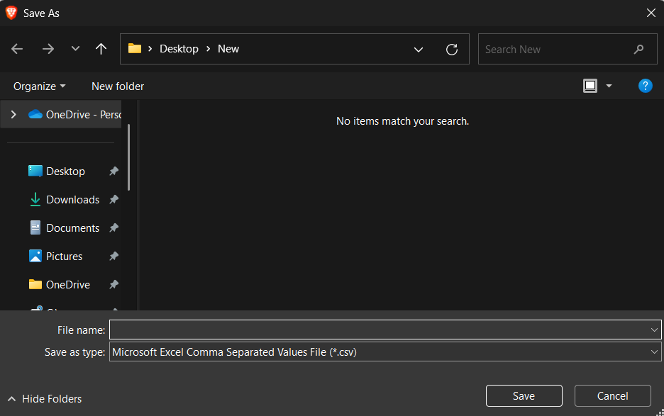 5。最後に、必要なファイルに名前を付けて、保存システムに.csvファイルをダウンロードするボタン。