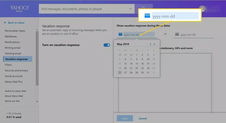 4。自動返信の開始日と終了日を選択し、テキストボックスに返信メッセージを書きます。