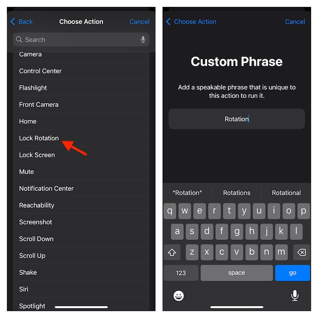 - これで、iPhoneのロック回転を微調整するカスタムフレーズを入力するように求められます。たとえば、「回転」。