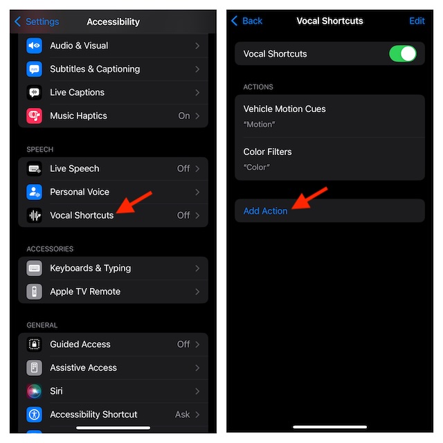 - このアクセシビリティ機能を既に試してテストしている場合は、タップしてくださいアクションを追加します。そうでなければ、損失ボーカルショートカットをセットアップします。