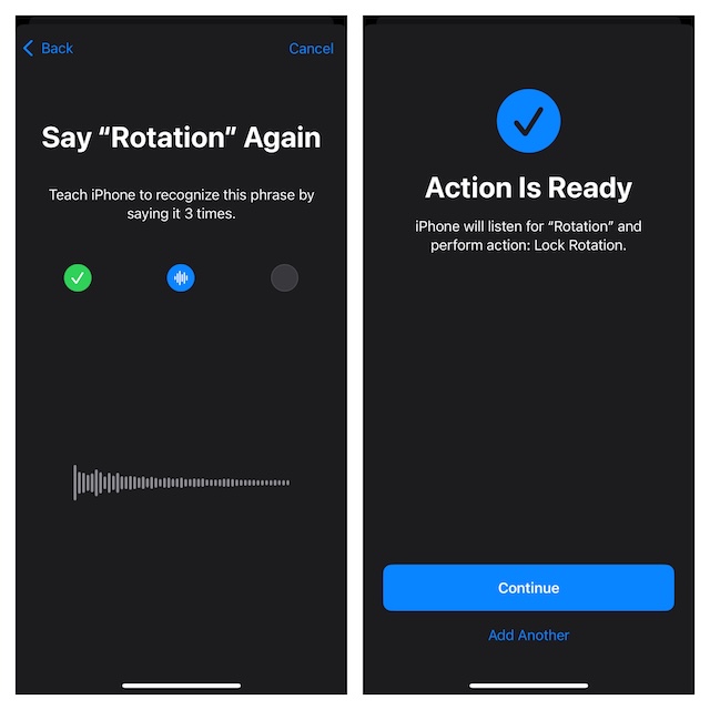 このハックの仕組みのスナップショットを提供するには、最初に「回転ロック」のカスタムフレーズを設定して確認する必要があります。検証が成功したら、指定されたアクションをジフィーでショートカットでトリガーできます。かなり甘いですね。