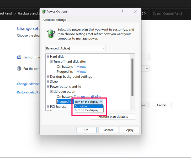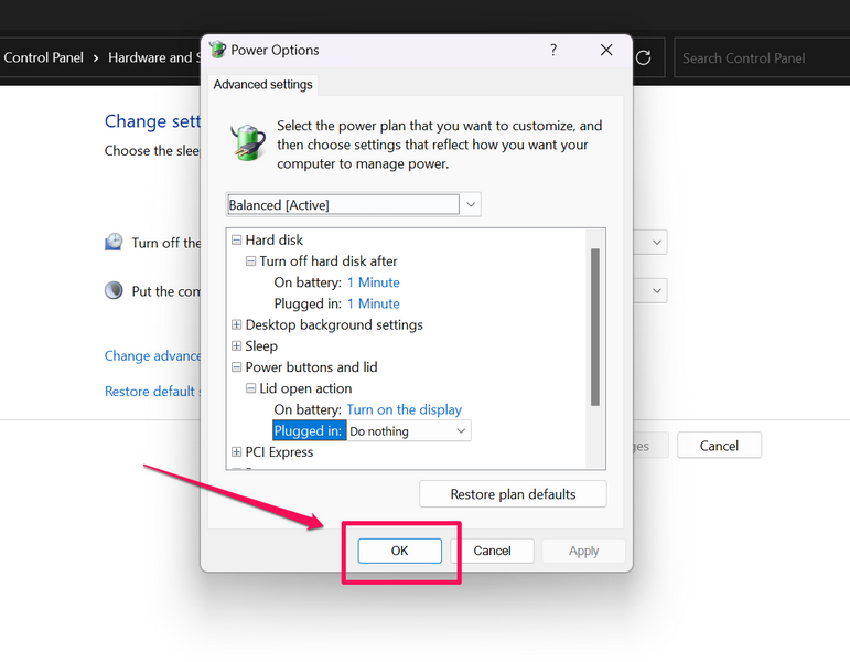7。選択したパワープランのガイドを使用して、蓋のオープンアクションのコマンドを実行したら、この変更は、特定の電力計画にのみ影響しますWindows 11ラップトップに。