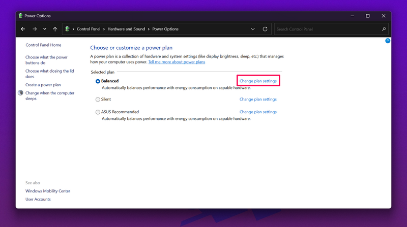4。でマークされた電力計画*です現在の電力計画Windows 11ラップトップで使用していること。