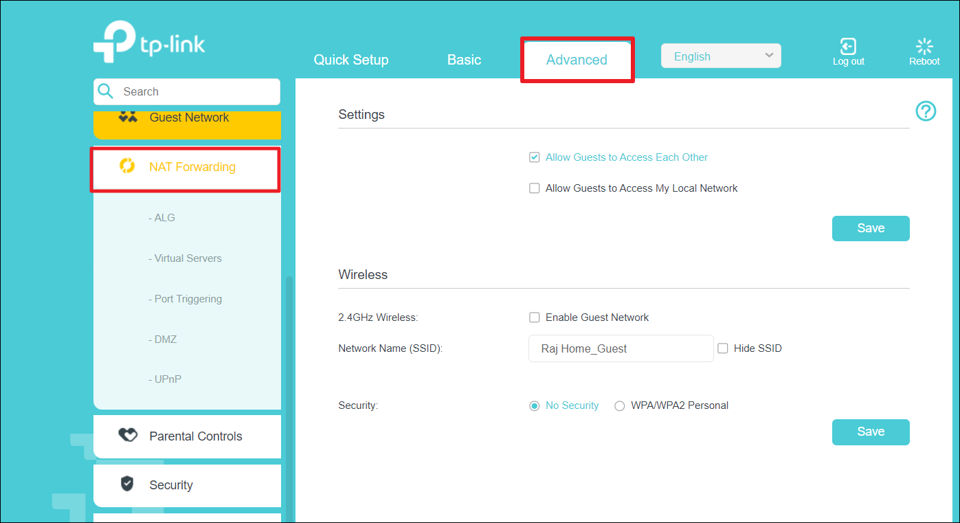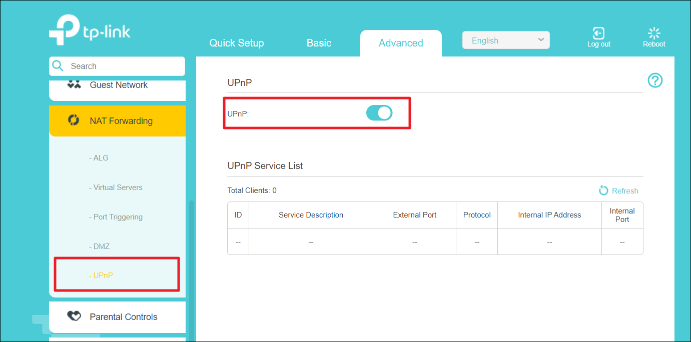 2。ルーターにログインしたら、UPNP設定(通常は 'の下にあります高度な'または 'NAT転送')。