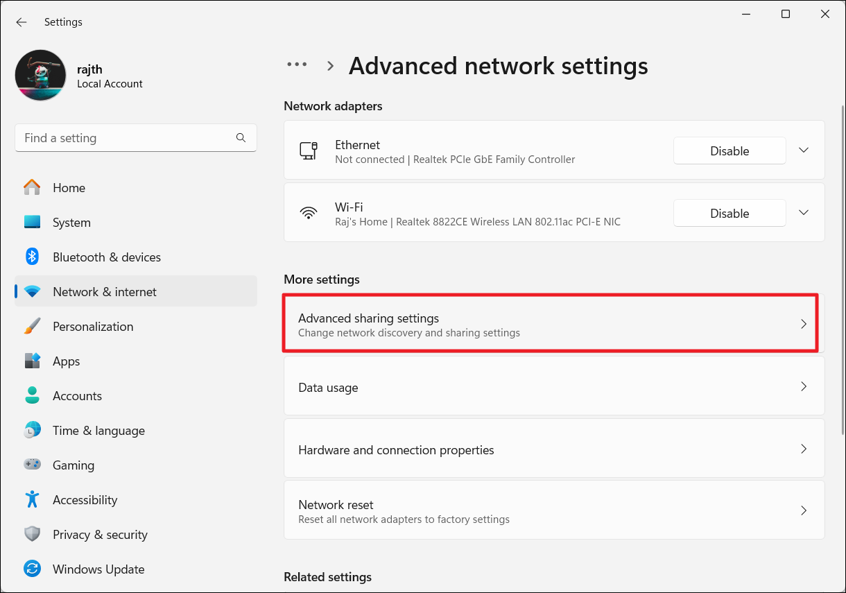 1。設定を開いて選択します 'ネットワークとインターネット'>'高度なネットワーク設定'。