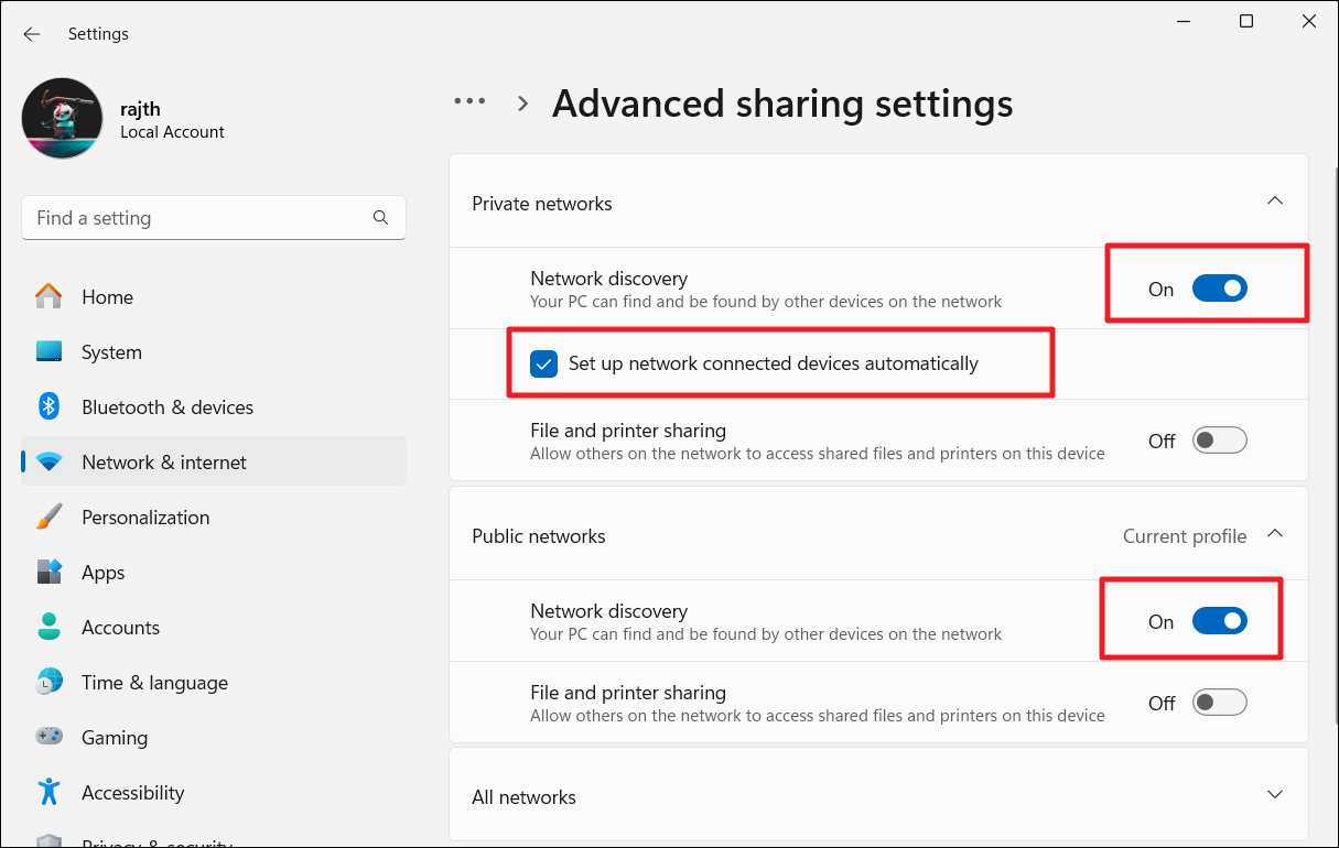 3。開きますプライベートネットワークセクション、トグルネットワークの発見「オン、チェック」ネットワーク接続デバイスを自動的にセットアップします'。