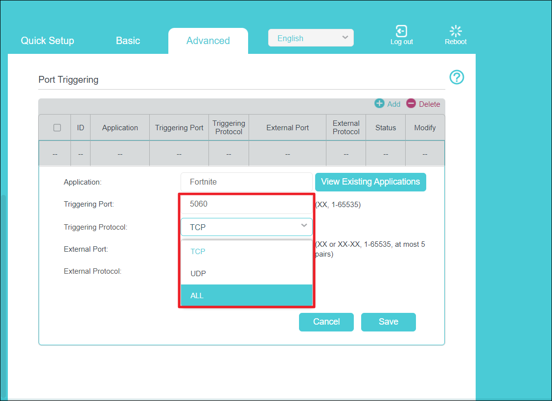 7.適切なプロトコルを選択します(TCPまたはUDP)あなたのゲームまたはアプリ用。ゲームやアプリが特定のプロトコル(TCPまたはUDP)を必要としない場合は、プロトコルをに設定してポート転送を簡素化できます全て。