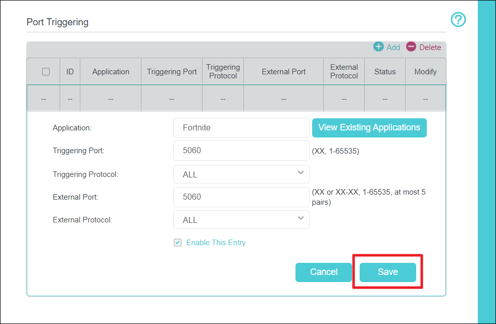 6。両方に同じポート番号を入力します」トリガーポート' または '内部ポート' そして '外部ポート'。