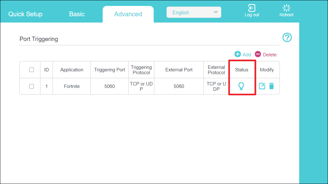 9.新しいルールがポート転送テーブルに追加されます。あなたはそれをいつでもオンまたはオフに切り替えることができます状態ボタン。