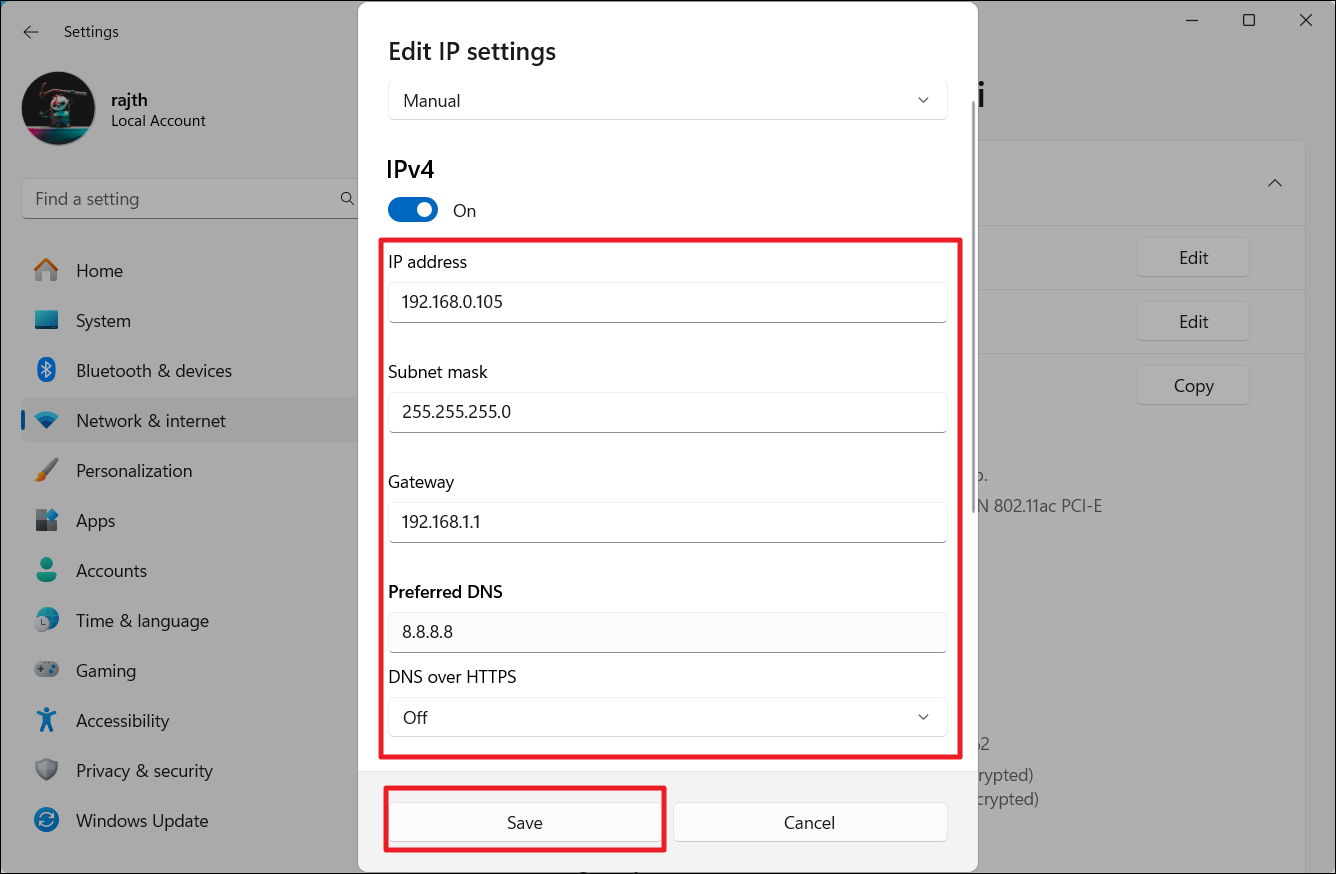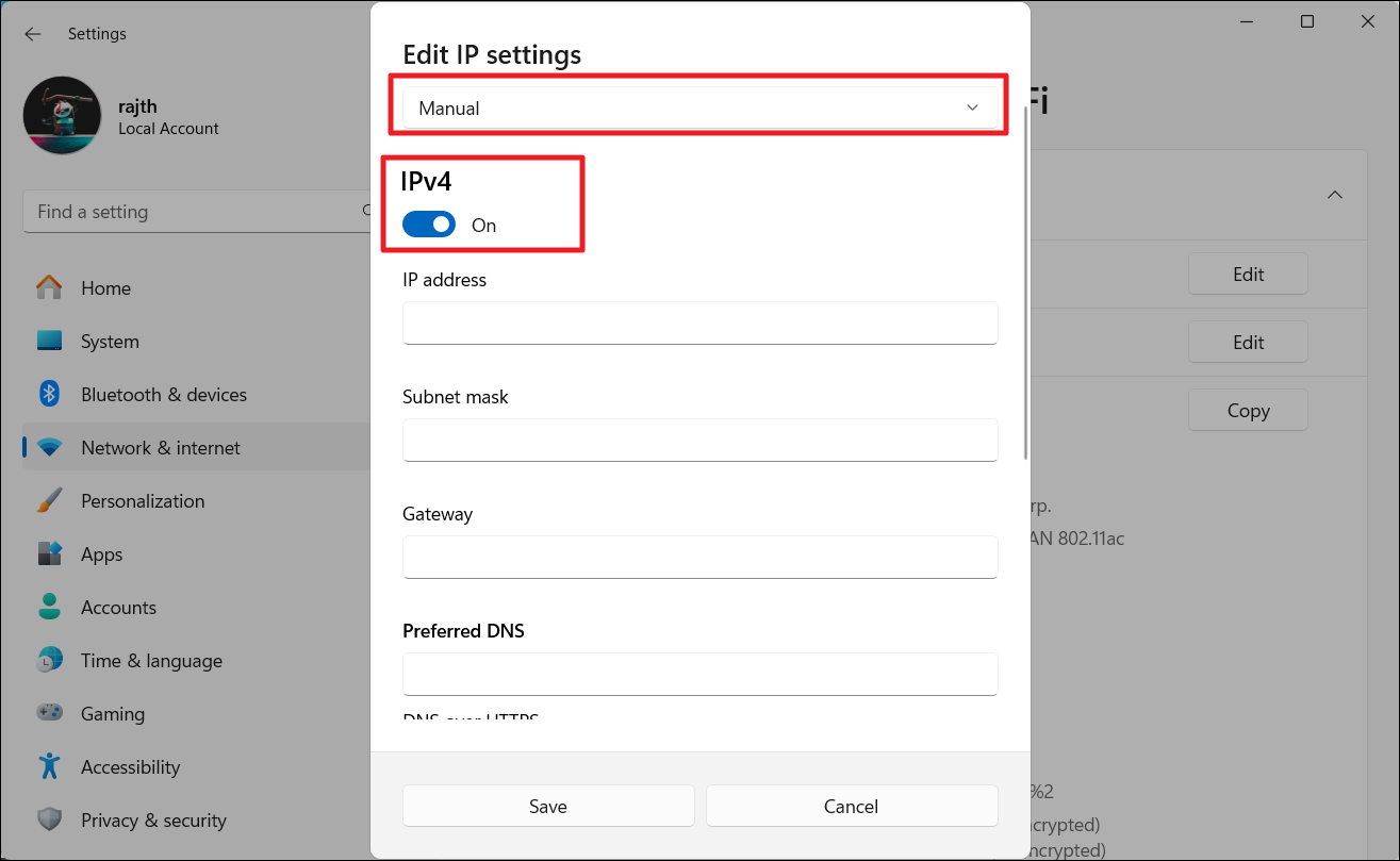 7。選択 'マニュアル'ドロップダウンメニューからオンになります。IPv4 'トグル。