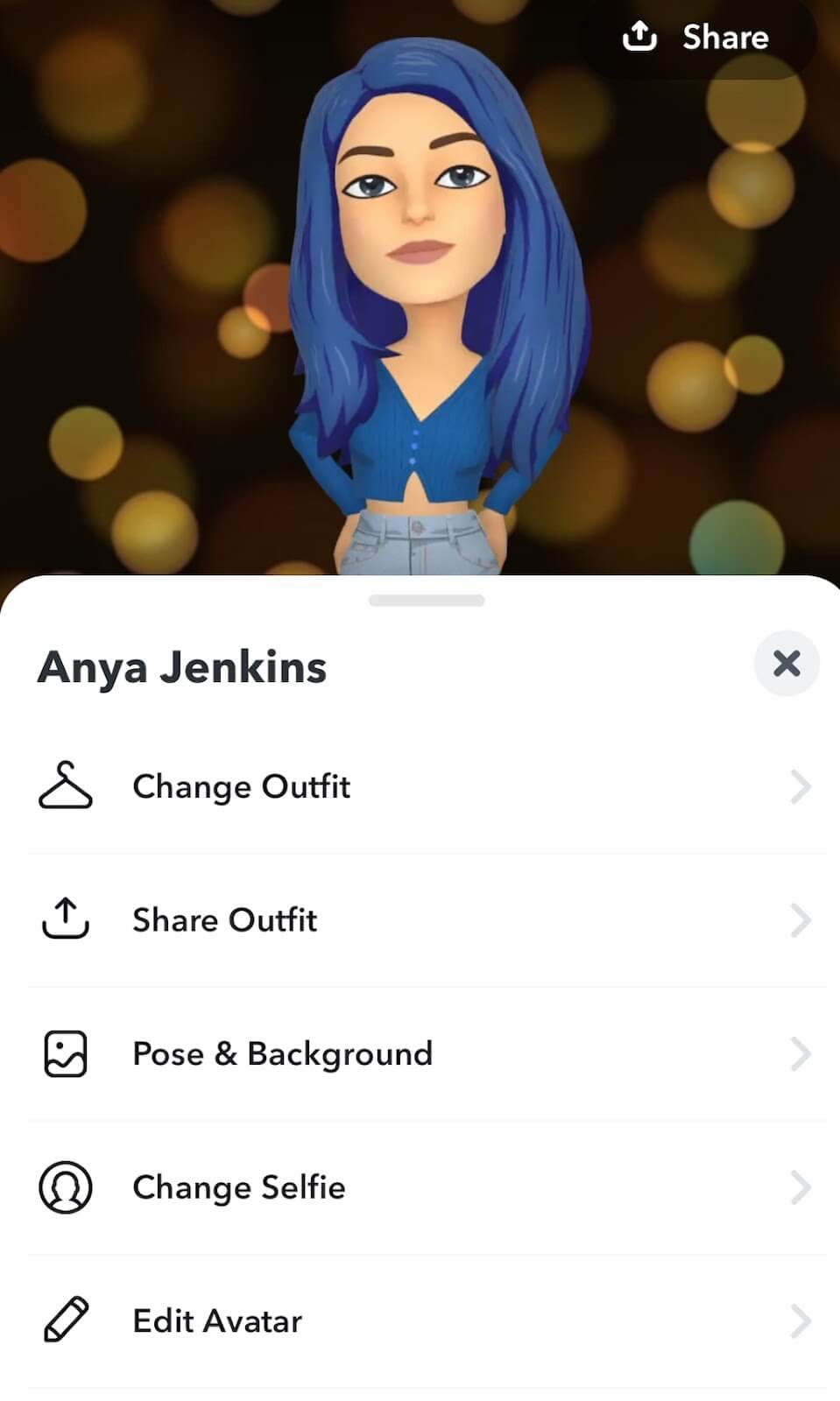 プロフィール設定でBitmojiをカスタマイズできます。まだbitmojiを持っていない場合は、選択してくださいBitmojiを作成します。それ以外の場合は、選択しますBitmojiアイコンカスタマイズオプションのいずれかを選択します。衣装を変更します、ポーズと背景、セルフィーを変えます、 またはアバターを編集します。