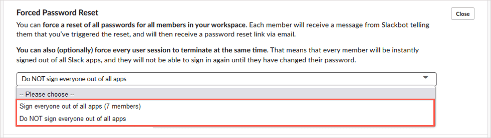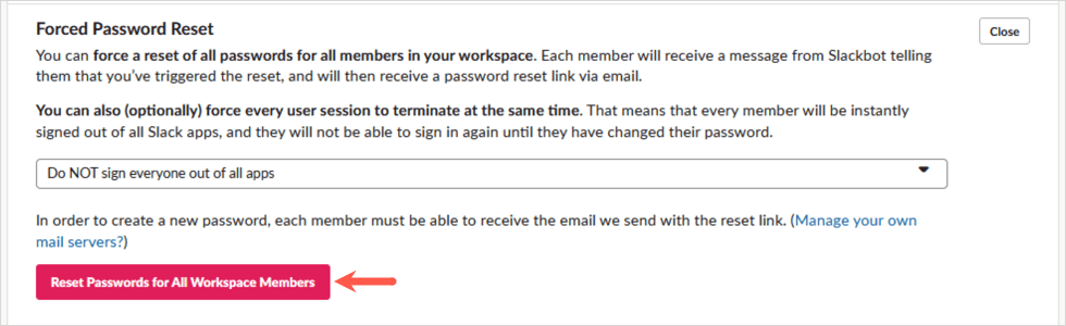- すべてのアプリから全員に署名しないでください:これにより、すべてのメンバーがサインインしますが、パスワードをリセットするスラックボットメッセージを送信します。その後、パスワードリセットリンクを使用してSlackから電子メールを受信します。