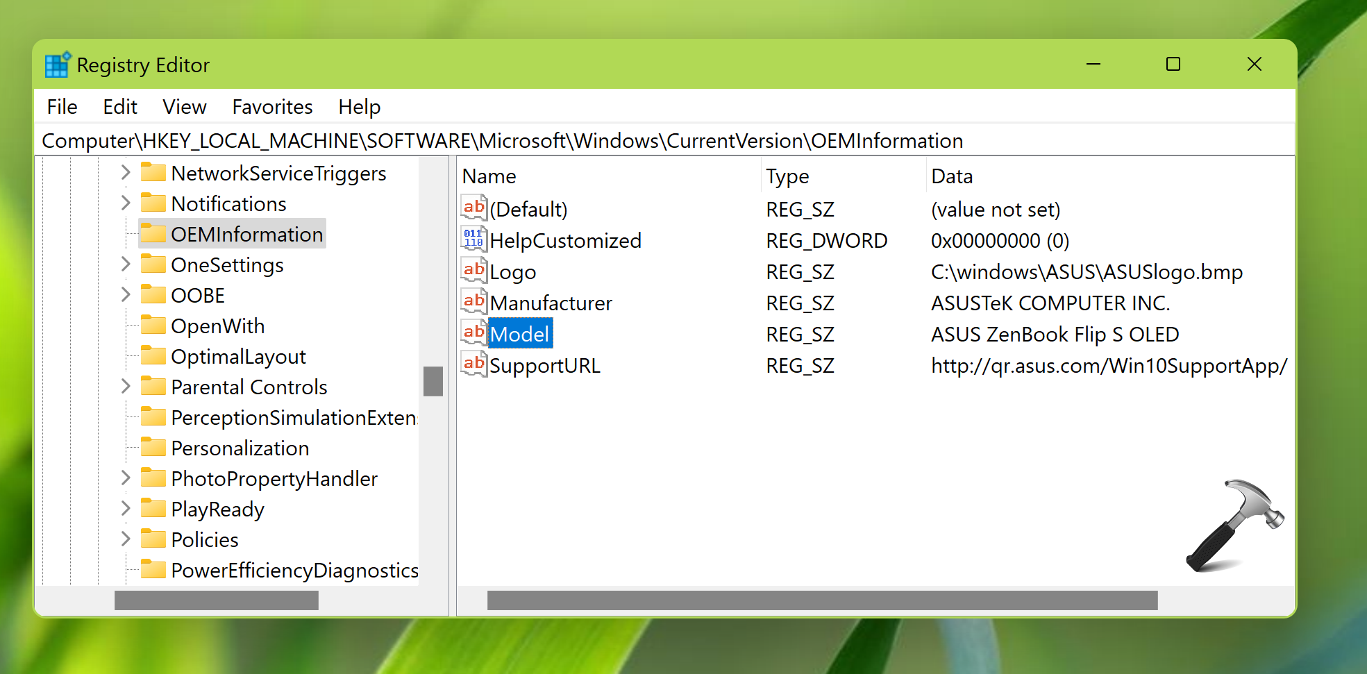 3。Oeminformationレジストリキーの下で、見つけることができますModelレジストリ文字列(reg_sz)。このレジストリ文字列をダブルクリックして、値データを変更します。