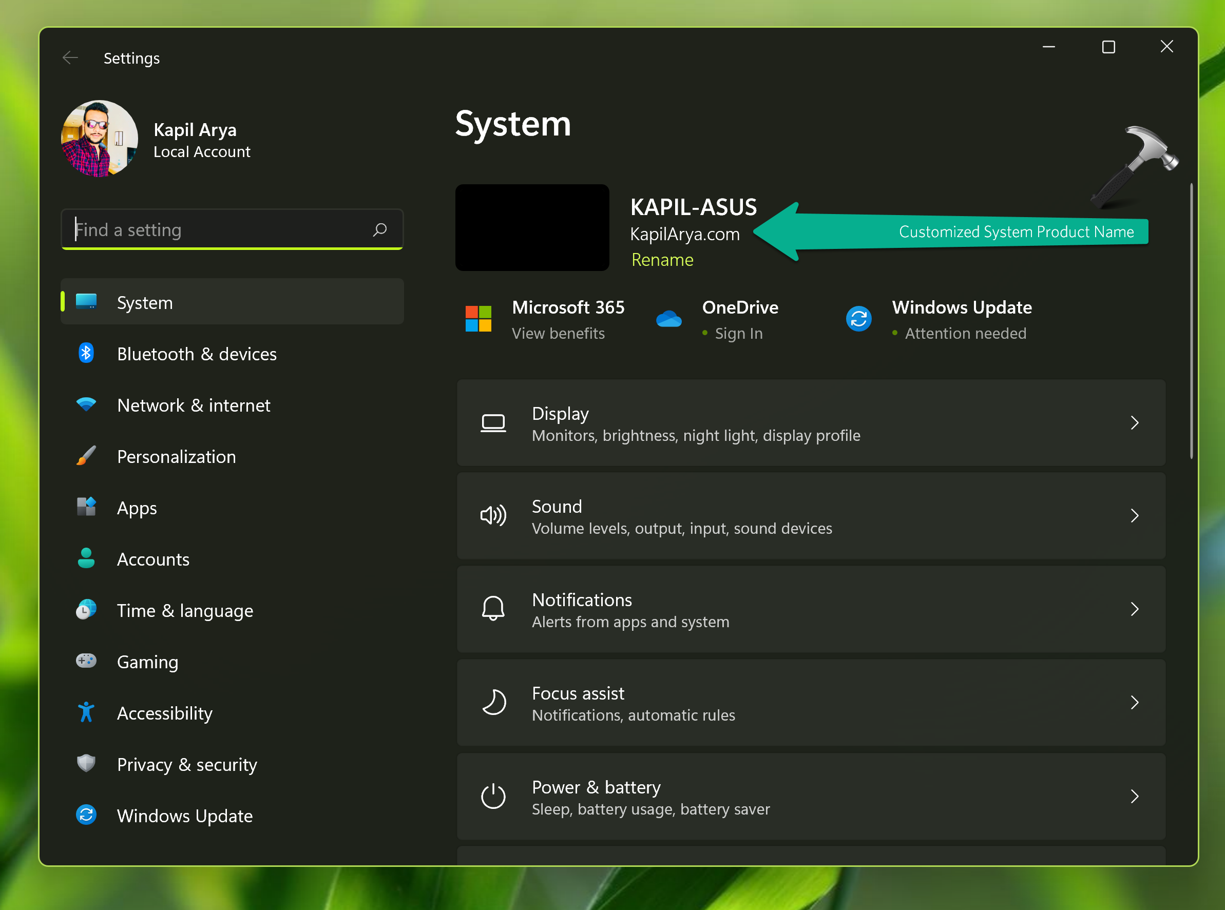 + i設定アプリを起動するキーが今すぐキーになります。設定アプリを開くと、システムの下で、以下に示すようにカスタマイズされたシステム製品名を見つけることができます。