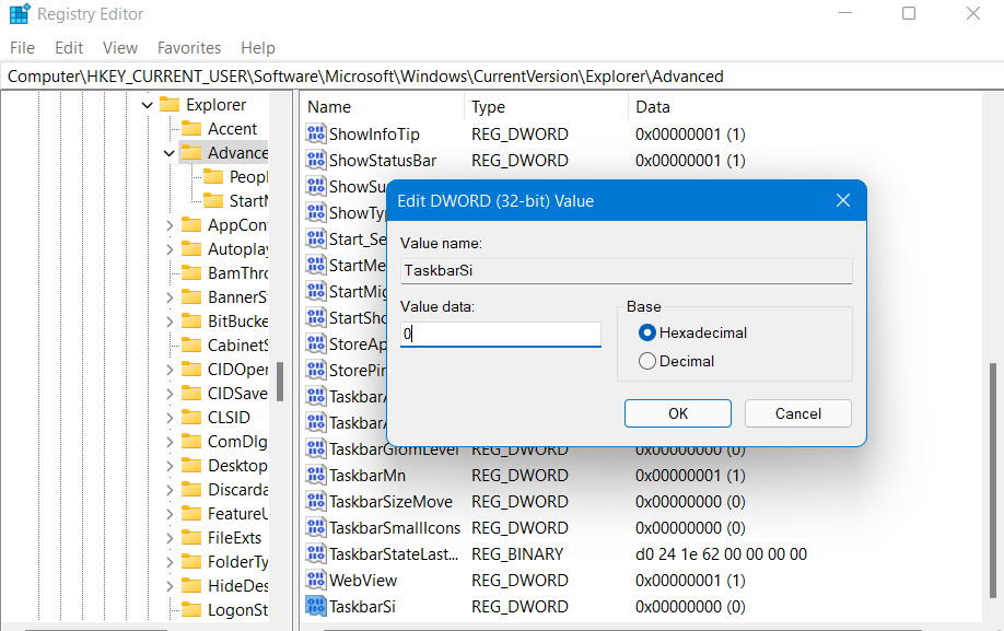 3。次に、ダブルクリックしますタスクバー値データを変更します0タスクバーのアイコンサイズを小さくするため。最後に、クリックしますわかりました。