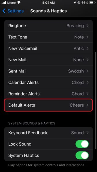 - 音と触覚の下で、タップしますデフォルトアラート。