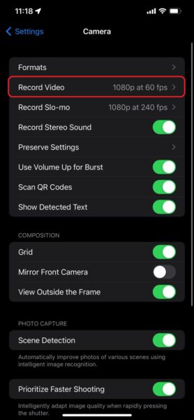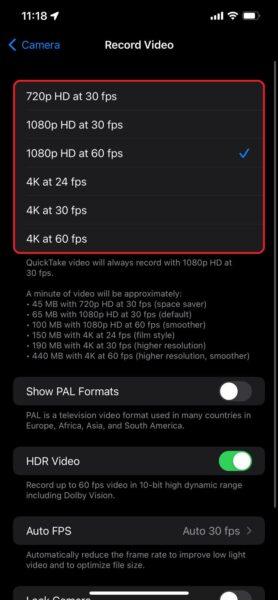 4K 60 FPSで撮影すると、見事な映像が発生する可能性がありますが、多くのビデオを撮影したいユーザーにとって最良の選択肢ではないかもしれません。 iPhoneのスペースを保存するか、大きなビデオを共有して送信するために必要な帯域幅とデータを保存する場合は、ビデオ解像度を減らすことで、サイズが小さくなる可能性があります。