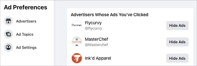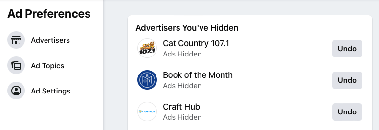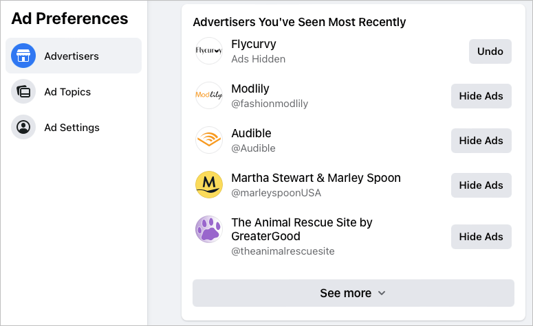 選択します広告主あなたが最近見たものを見るために。リストにある広告主の1人を隠すには、広告を非表示にします彼らの名前の右側。これを行うと、広告を非表示にしますボタンが変更されます元に戻します気が変わったらボタン。