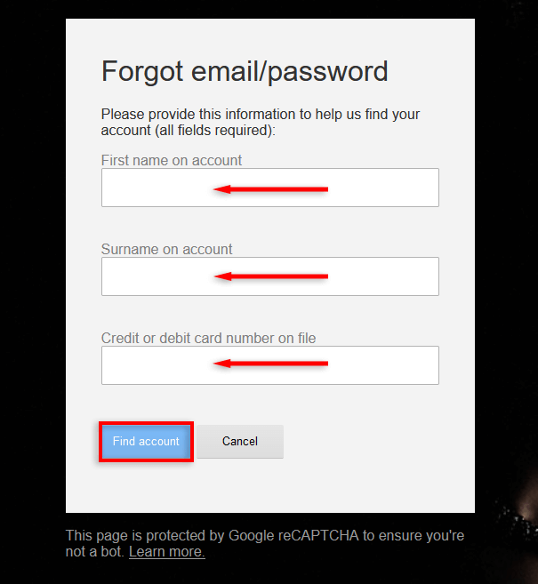 - アカウントで使用されている最初の名前と姓とクレジット/デビットカード番号を入力してから、選択してから選択しますアカウントを見つけます。