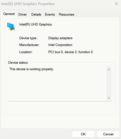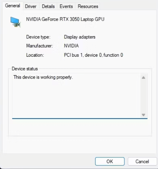 永続的なGPU問題は、エラーコードまたは警告として、デバイスステータスセクションに表示されます。問題がない場合は、ここで言及されている「このデバイスが適切に機能している」ことを観察します。