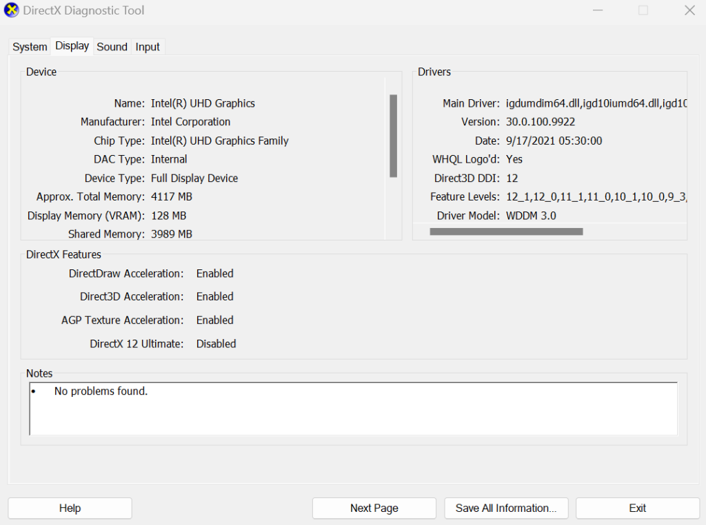 DirectX診断ツールは、ある場合、GPU関連の問題をここに示します。ただし、すべてが必要な場合に機能する場合は、「問題は発見されていない」という励ましの声明を受け取ります。
