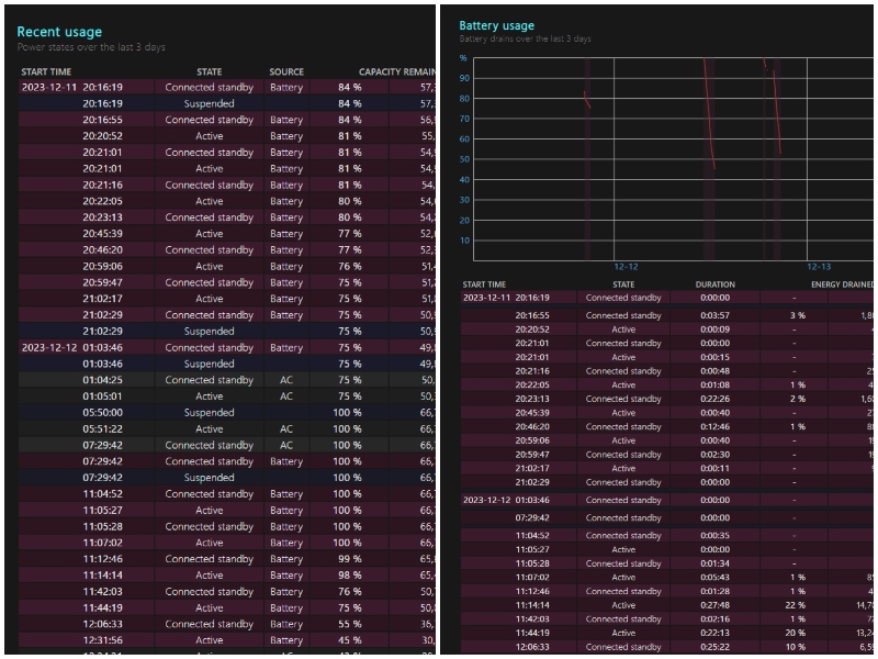 さて、それが次のような他のセクションに関しては最近の使用、バッテリーの使用、バッテリー容量の履歴、 そしてバッテリー寿命の見積もり、それらはすべての最近のバッテリーデータを表形式の形で含んでいます。これらのテーブルを通過して、Windows 11ラップトップのバッテリーの使用について詳しく知ることができます。