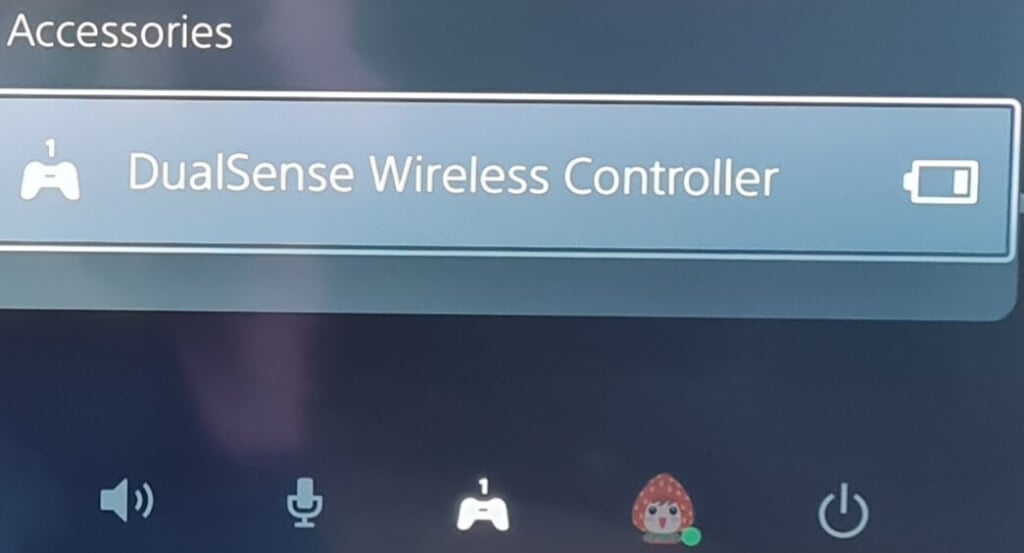 - anアクセサリーポップアップが表示され、デュアルセンスワイヤレスコントローラーのバッテリーレベルが表示されます。フル用の3つのバー、1つは低いバッテリー用です。