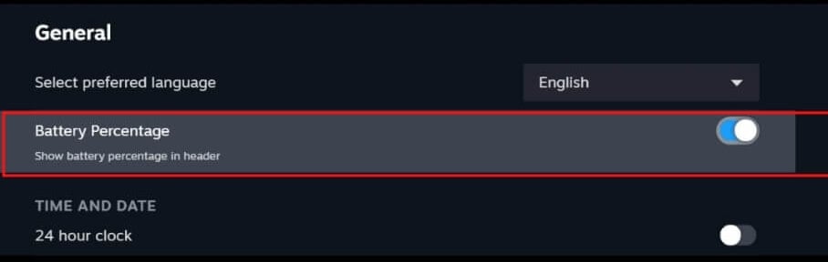 - 下一般的な、を確認しますヘッダーにバッテリーの割合を表示しますトグルがオンです。