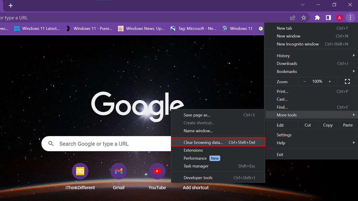 - 開けるクロムブラウザ>クリックします3ドットアイコン右上のコーナー>カーソルをホバリングしますその他のツール>クリックしますクリアブラウジング データ。