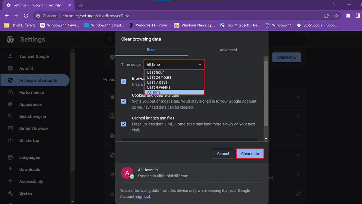 - ボックスを確認してくださいCookieおよびその他のサイトデータ>クリックします時間範囲ボックス(過去1時間、最後の24時間、最後の7日間、最後の4週間、または常にクレジットを選択できます)> [クリアしたいデータの量を選択]> [データをクリアしますボタン。