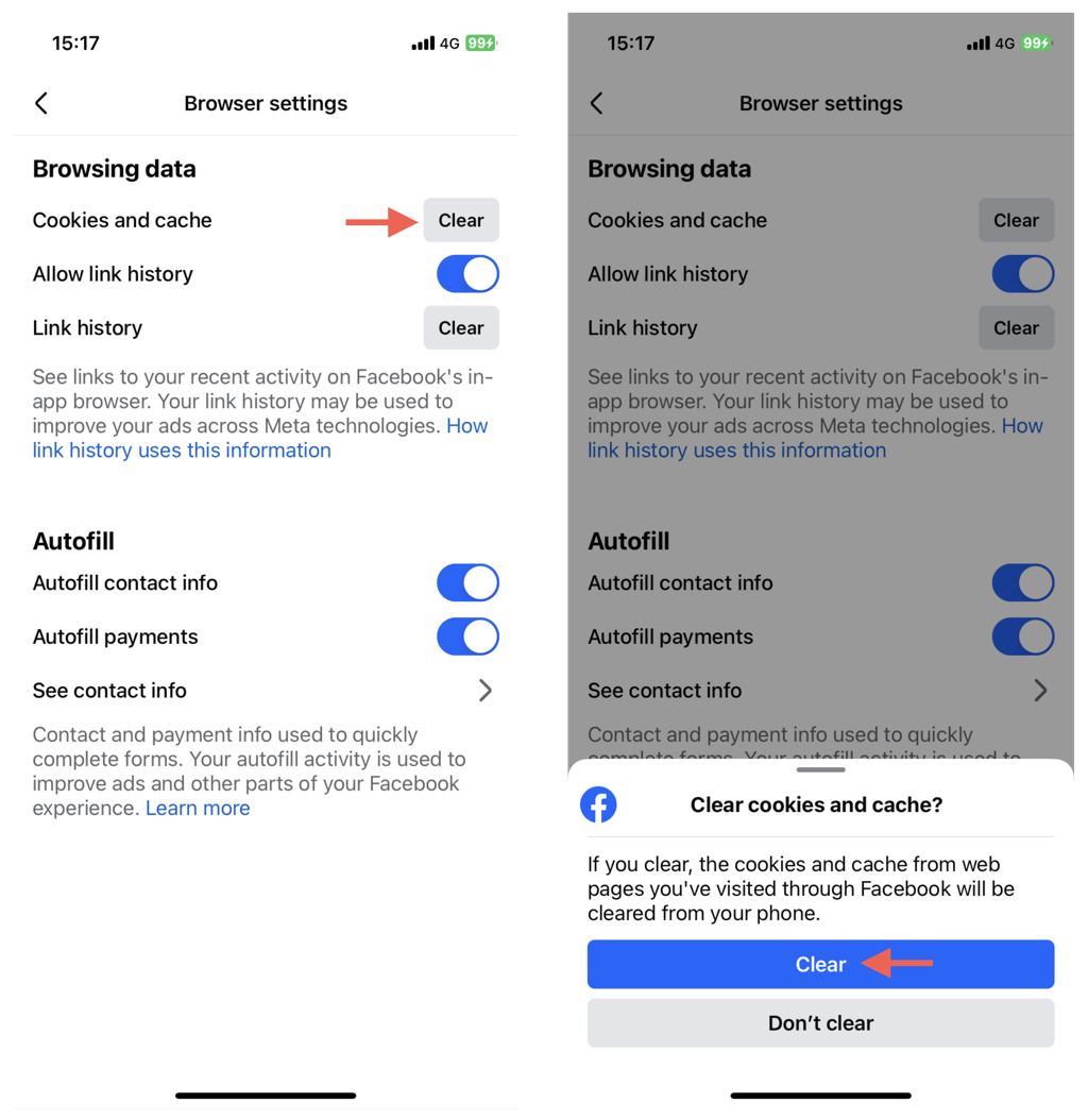 Facebookアプリには、リンクを開いて対話できるようにする組み込みブラウザーがあります。幸いなことに、このアプリは、リンクの読み込みに問題がある場合にキャッシュをクリアするオプションを提供します。
