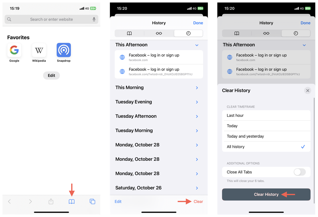 - 選択しますすべての歴史タップします明確な歴史。