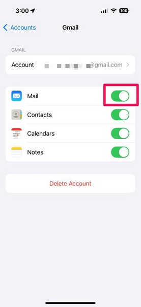 5。次のページで、トグルをタップしますのために郵便選択したアカウントをメールで無効にするアプリ。