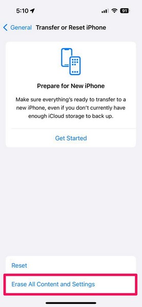 4。次のページで、をタップしますすべてのコンテンツと設定を消去しますプロセスを開始するボタン。