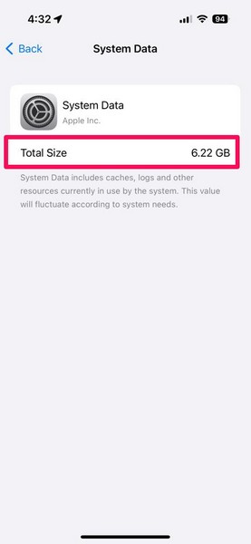 5。ここに、あなたはそうするでしょうシステムデータの量を見つけます現在、iPhoneに保存されています。